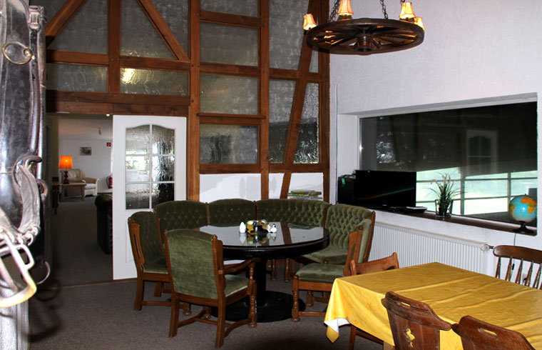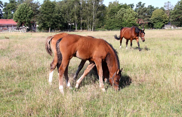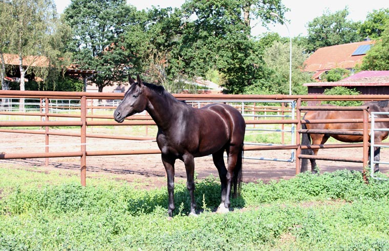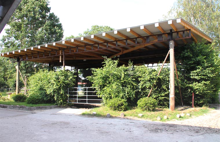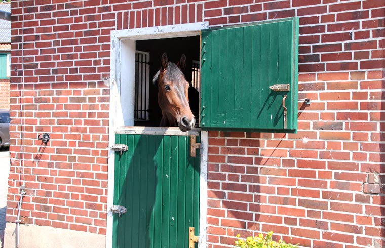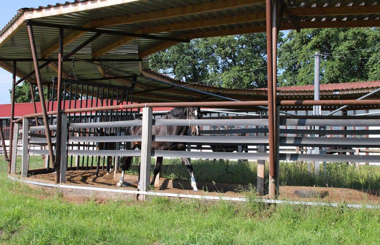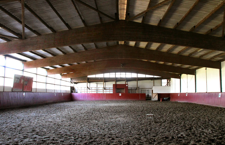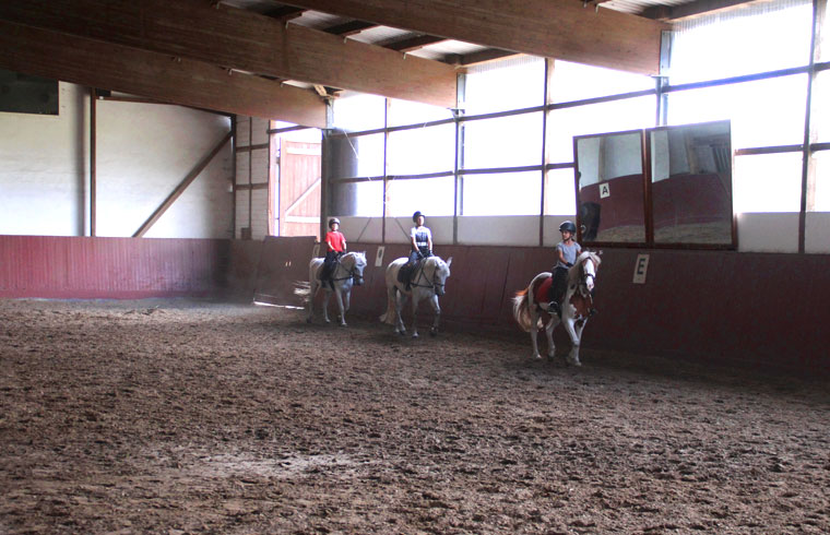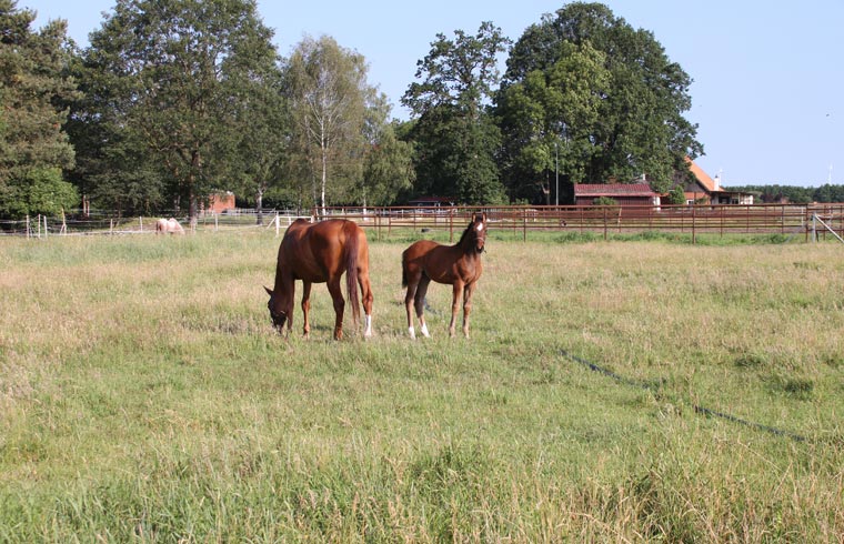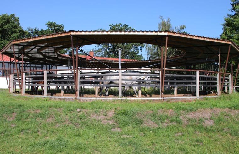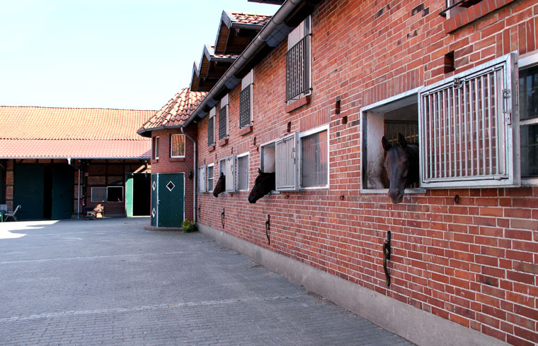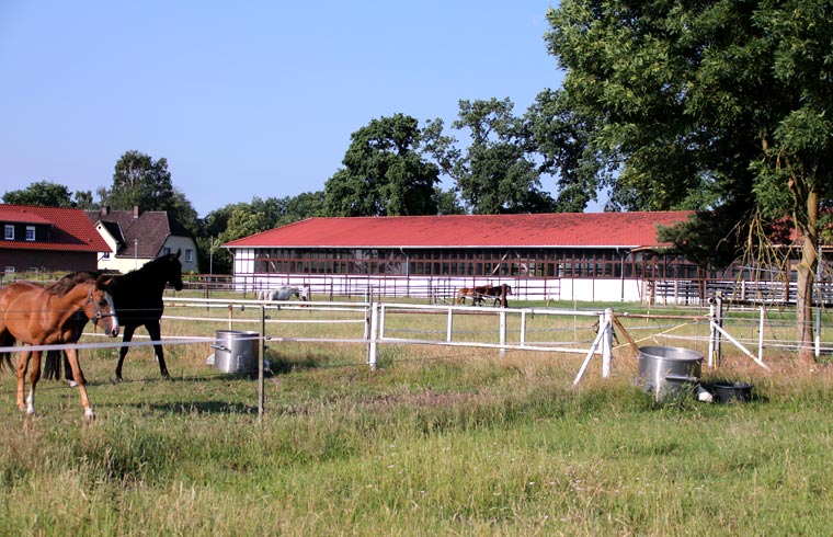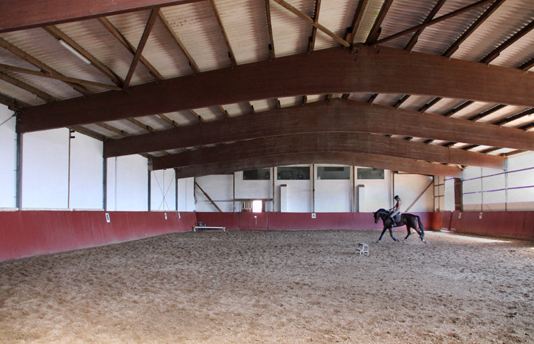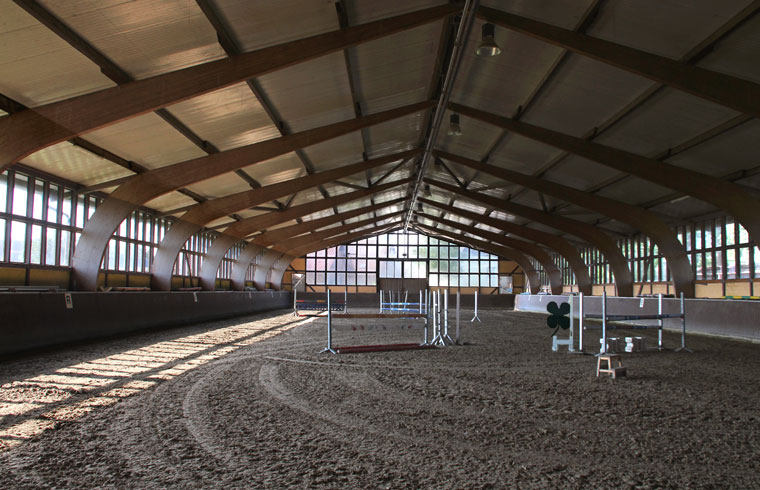 Fohlen sowie einen Reitplatz, Weiden, Paddocks, einen überdachten Longierzirkel, eine Führanlage und zwei Reithallen bereit. Eine Reithalle hat die Normalmaße von 20 x 40 m, die große Halle hat olympische Maße mit 20 x 60 m und ist durch große Fensterwände besonders hell.